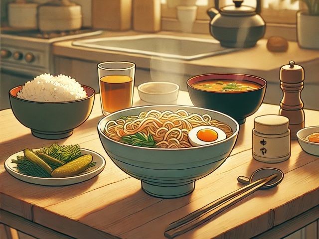 包丁のトントン、肉を焼くジュワッ、麺をすするズズズッ……。